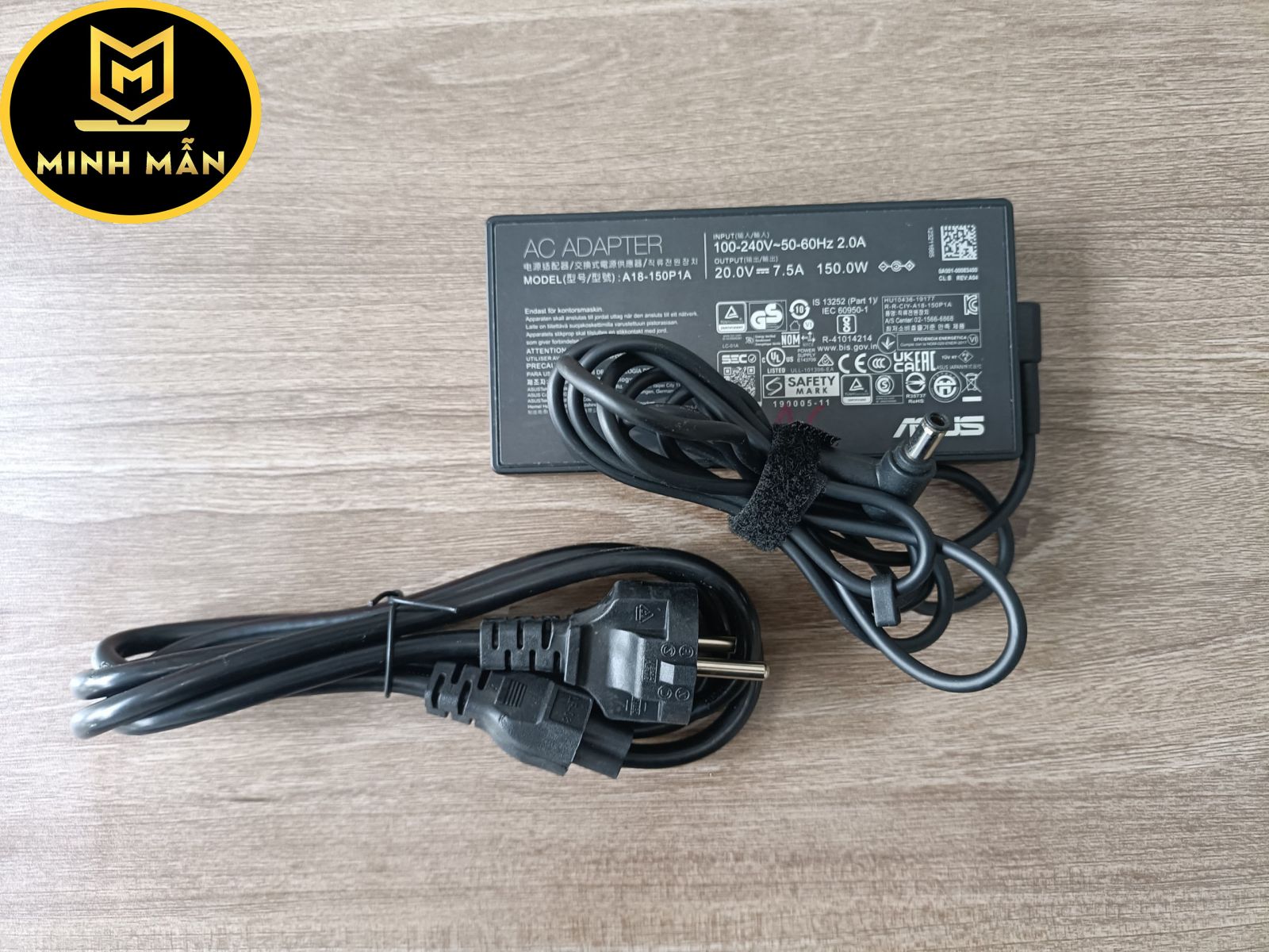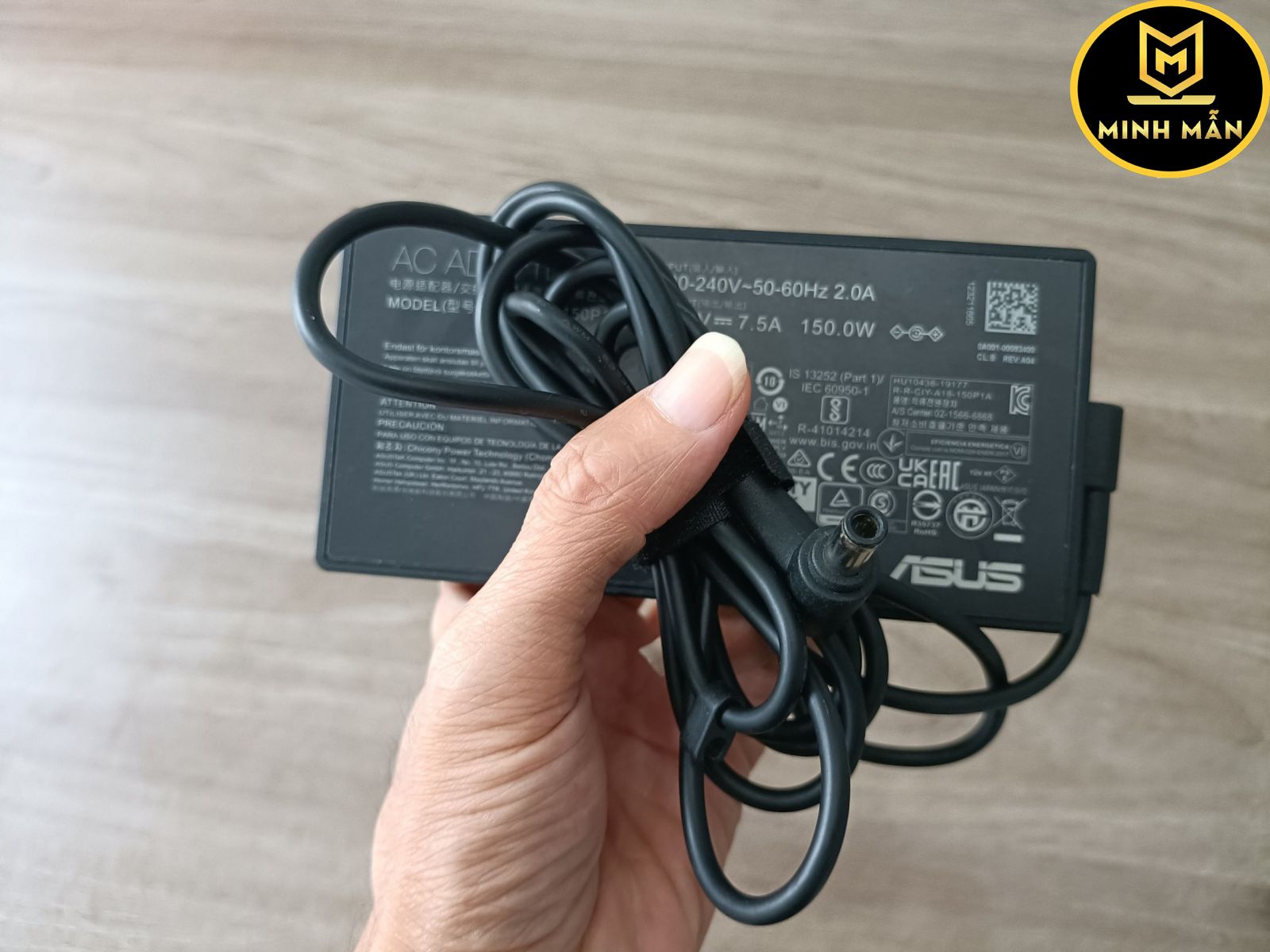 - Có một số ít cục sạc laptop asus thì chỉ in điện áp (V) và dòng điện (A), ví dụ như: 20.0V - 7.5A bạn có thể tính ra công suất của sạc bằng cách lấy Điện áp (V) nhân với Dòng điện (A) như sau (20 x 7.5 = 150W).